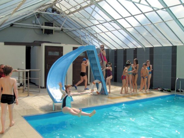 Na zamkniętym, bezpiecznym terenie znajdują się boiska do gry w piłkę, świetlica a nawet kryty basen !